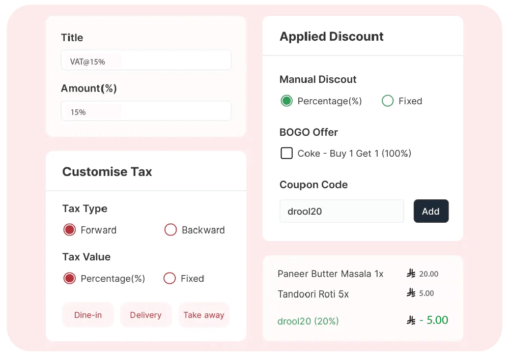 يمكنك ضبط معدلات الضرائب المخصصة والخصومات التلقائية والأسعار الترويجية بسهولة. سواء كنت بحاجة إلى خصومات على أساس النسبة المئوية أو خصومات ثابتة، فإن نظامنا يضمن لك الحسابات الضريبية الدقيقة والشفافية في التسعير، مما يساعدك على الامتثال للوائح مع تعزيز رضا العملاء.