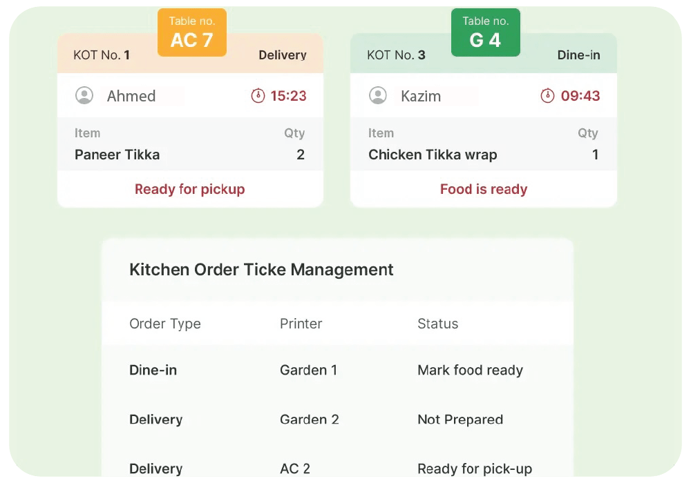 ارتق بسير عمل مطبخك باستخدام نظام طباعة تذاكر طلبات المطبخ التلقائية. يتم إرسال الطلبات مباشرة إلى محطات المطبخ المخصصة، سواء الشواء أو السلطات أو الحلويات، مما يضمن تنفيذ الطلبات بدقة وتقليل الأخطاء وتسريع الخدمة، وبالتالي يحافظ فريقك على نظام العمل ويحصل عملاؤك على وجباتهم في الوقت المحدد.